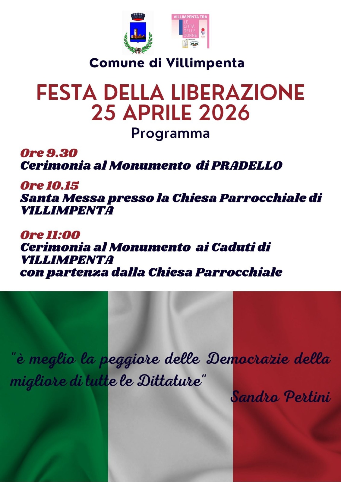 In occasione della Festa della Liberazione, l’Amministrazione Comunale ha predisposto un programma di cerimonie istituzionali per la giornata di sabato 25 aprile 2026.