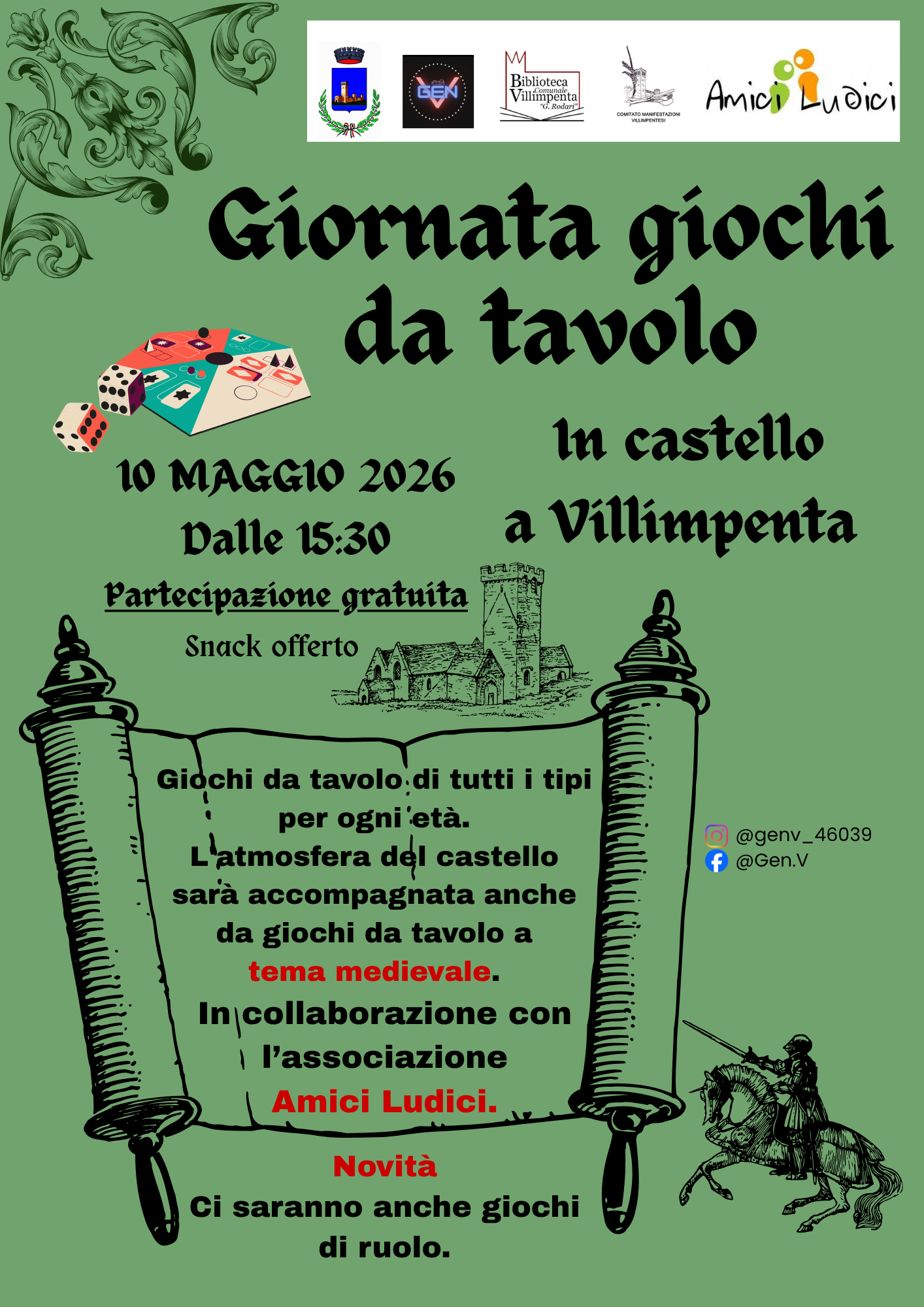 Domenica 10 maggio, dalle 15:30, il Castello di Villimpenta ospita un evento gratuito aperto a tutte le età in collaborazione con l'associazione Amici Ludici. Potrete cimentarvi con giochi da tavolo classici, ambientazioni medievali e la novità dei giochi di ruolo. Snack offerto per tutti i partecipanti.