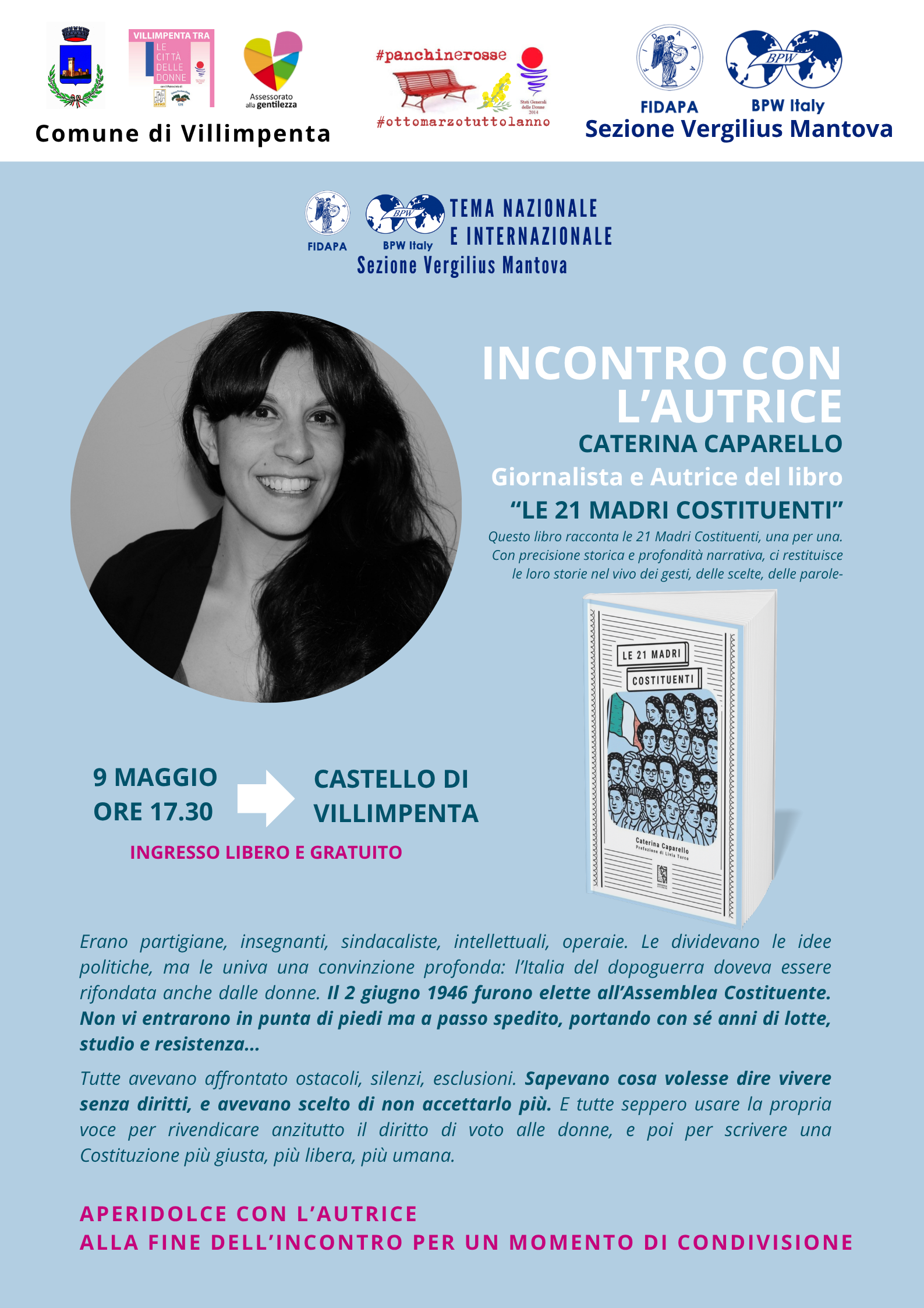 Il 9 maggio alle 17:30, presso il Castello di Villimpenta, la giornalista Caterina Caparello presenterà il suo libro dedicato alle donne dell’Assemblea Costituente. Un incontro a ingresso libero per riscoprire storie di coraggio e partecipazione, seguito da un "aperidolce" conviviale per dialogare insieme all’autrice.