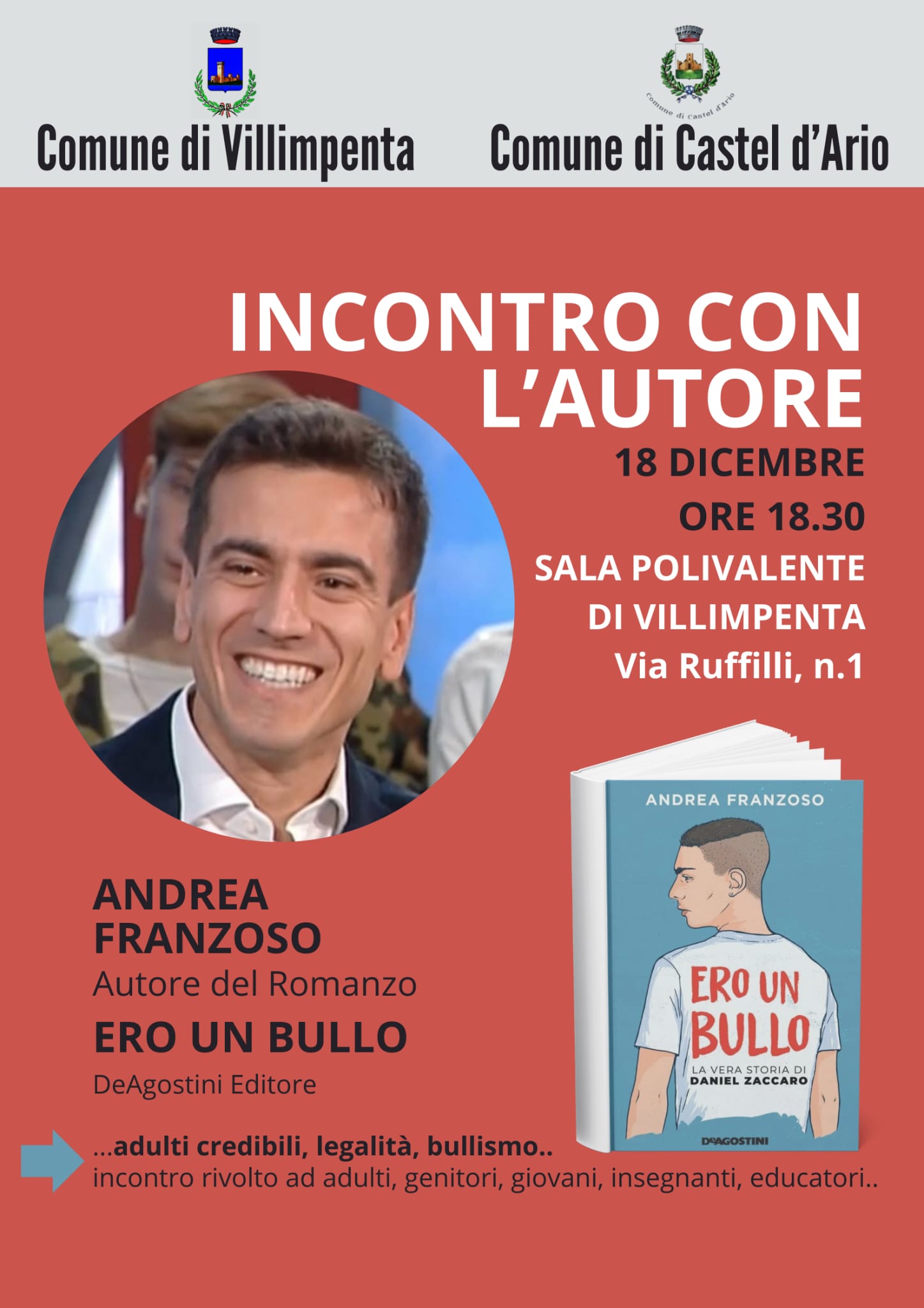 I Comuni di Villimpenta e Castel d'Ario invitano la cittadinanza all'incontro pubblico con l'autore Andrea Franzoso, un evento incentrato su legalità, bullismo e l'importanza di adulti credibili. Andrea Franzoso, ex ufficiale dei Carabinieri, presenterà il suo romanzo best seller "Ero un Bullo", una storia vera di riscatto e crescita personale.